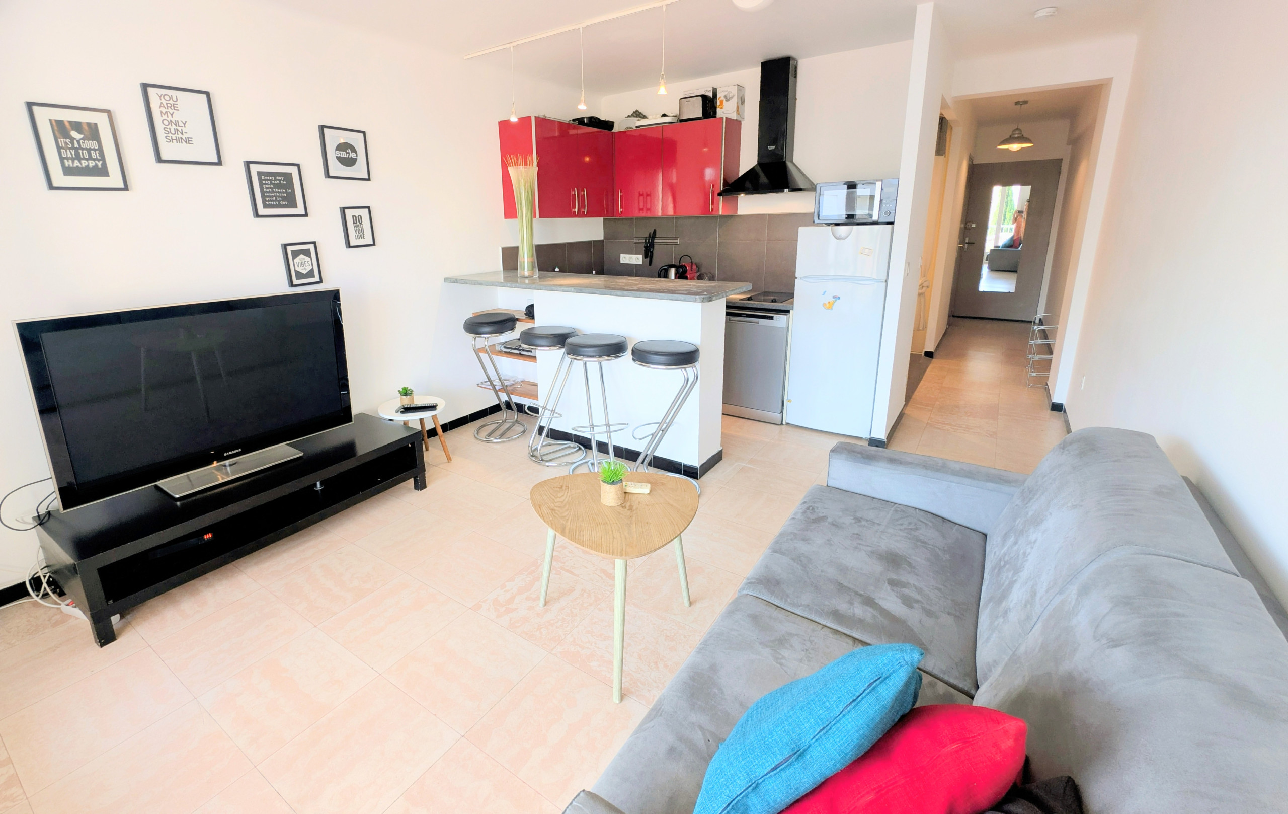 - A bright living area with sofa bed, TV, and open-plan kitchen